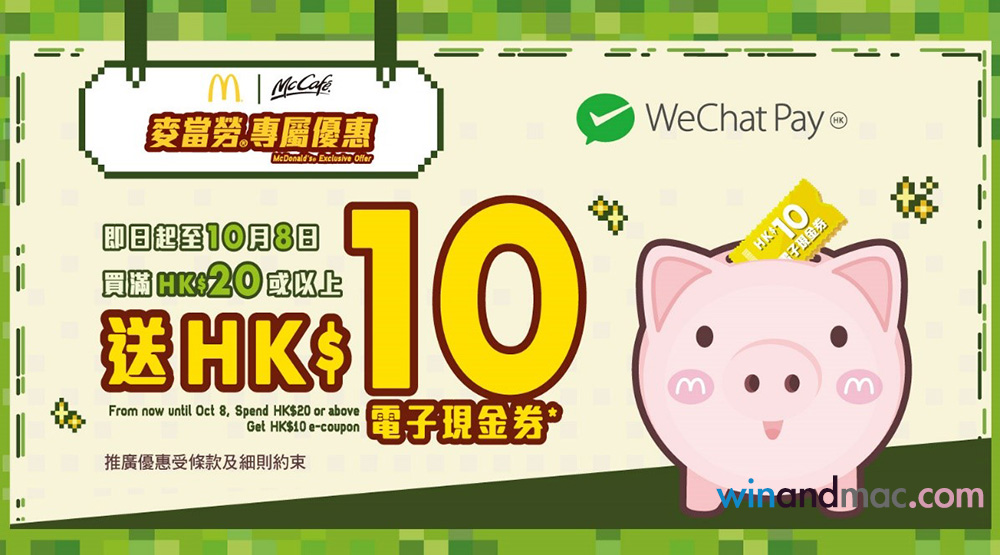 因為今次優惠是在香港麥當勞餐廳惠顧任何食品滿HK$20或以上,便能獲贈HK$10電子現金券一張,即用家要在下一次消費才能使用。推廣期內每位用戶最多可獲贈7張HK$10電子現金券,每日最多可獲取優惠一次。電子現金券將即時自動發放至用戶的WeChat Pay香港錢包賬戶內,但正如剛才所說,每一次獲現金券後,都要等下次才能使用。