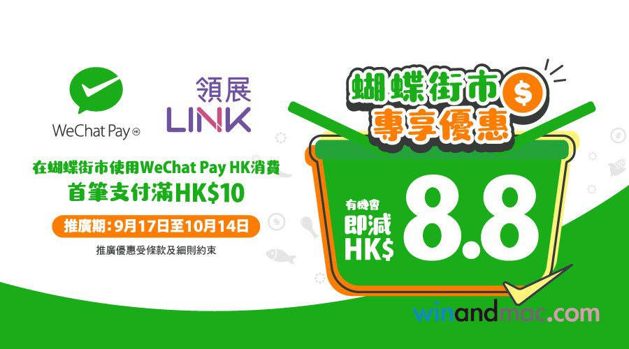 大陸微信支付今次宣佈全面與香港領展旗下的街市和商場合作,提供有關支付服務,大家可以減少使用現金,更全面電子化,並可在大陸的付款系統中全面查閱過往記錄。由即日起至10月14日,大陸微信支付的香港用戶於蝴蝶街市消費,首筆支付滿HK$10並使用微信支付付款,即可享HK$8.8折扣優惠。留意是有機會而已,優惠名額有限,先到先得,送完即止。