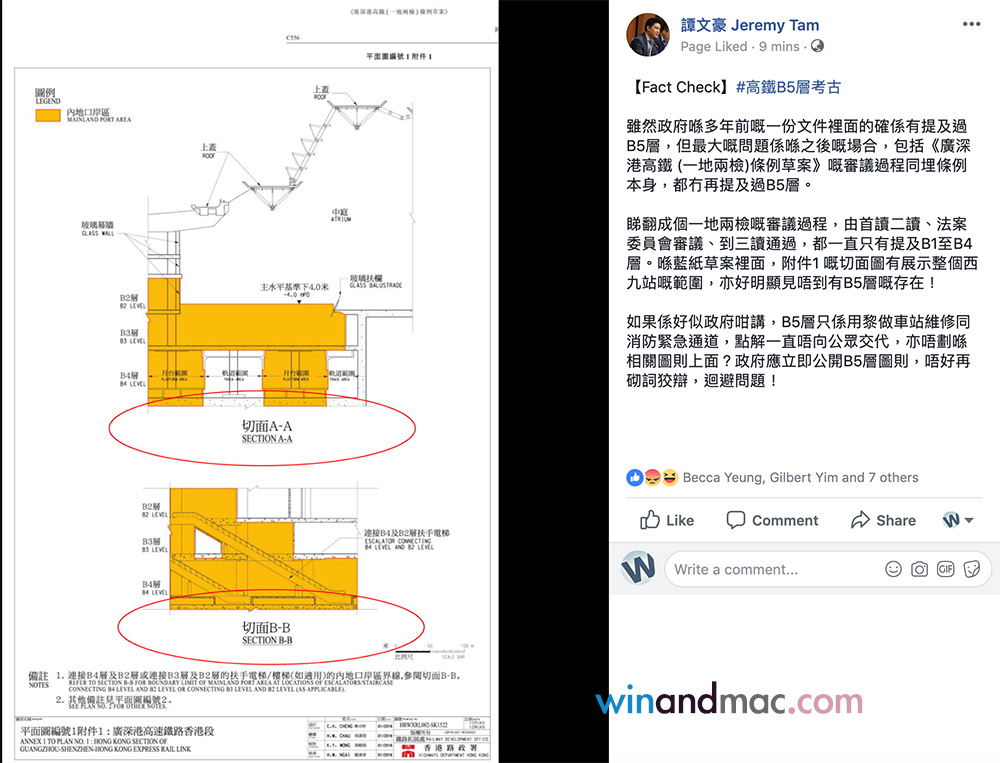 香港特首林鄭月娥昨日回應記者查詢時,指當中的B5層並不神秘,一直有在文件中交待。可是,譚文豪指出,在之後的場合,包括《廣深港高鐵(一地兩檢)條例草案》的審議過程,以至條例本身,其實沒有提及B5層。
