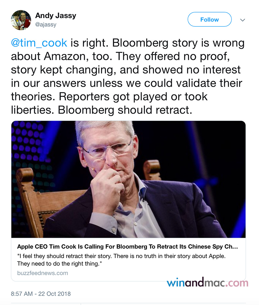 Tim Cook早前接受BuzzFeed訪問,學足大陸政府般要求Bloomberg撤回大陸解放軍以硬件入侵蘋果、Amazon其他科技公司的報道。訪問出街後,Amazon AWS Andy Jassy和Super Micro都開口,要求立即撤回有關報道。