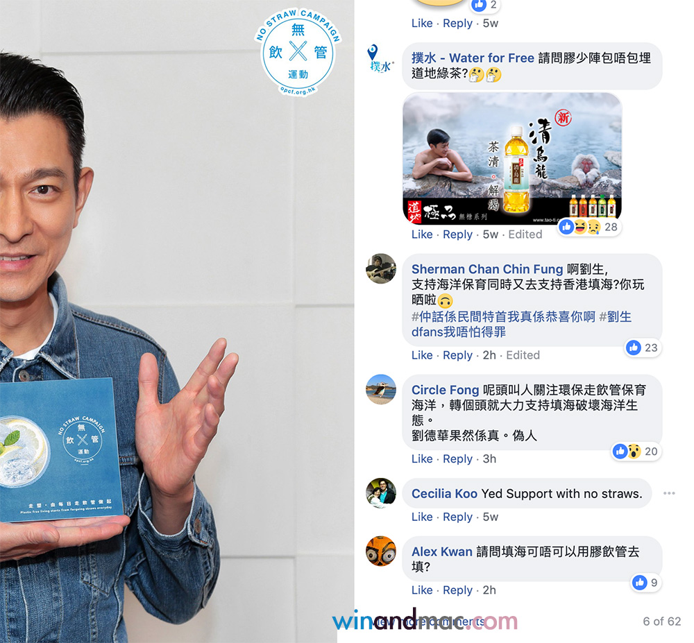 有關無飲管活動在8月時發佈,當時劉德華是幫香港海洋公園保育基金宣傳,他拿著宣傳牌,希望大家不要使用飲管。唯如今他卻幫團結香港基金大力支持填海,令不少人質疑十分矛盾,因為填海一定會破壞海洋生態,亦令人認為藝人就是這麼虛偽。
