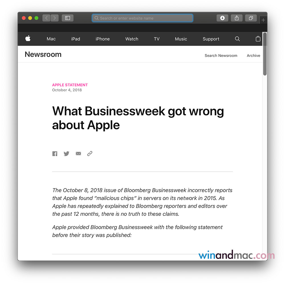 蘋果稱Bloomberg曾多次與他們聯絡,每一次蘋果都否認有關報道,並有再次進行相關檢查,都發現沒有問題。蘋果指出,他們從來沒有找到任何有被入侵晶片,亦沒有找到被改動過的硬件,伺服器亦沒有找到任何漏洞。蘋果亦沒有與FBI或相關法律安全部門聯絡,更沒有任何相關的調查。