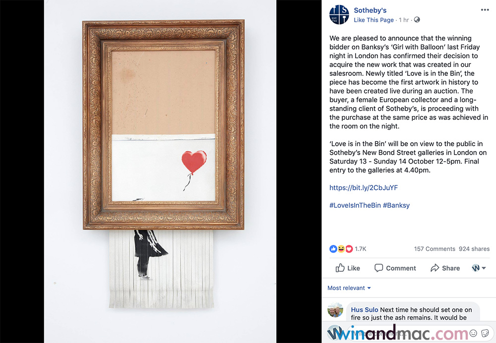 雖然已經過了好幾天,又有不少人質疑與Banksy夾埋,但Banksy作品自動被碎紙機破壞事件,仍然有不少人樂此不彼。如今負責拍賣的Sotheby’s蘇富比正式宣佈,有關作品仍然會照原拍賣價售出,但作品將會改名為Love is in the Bin,於本週末在倫敦的畫廊作最後展出。