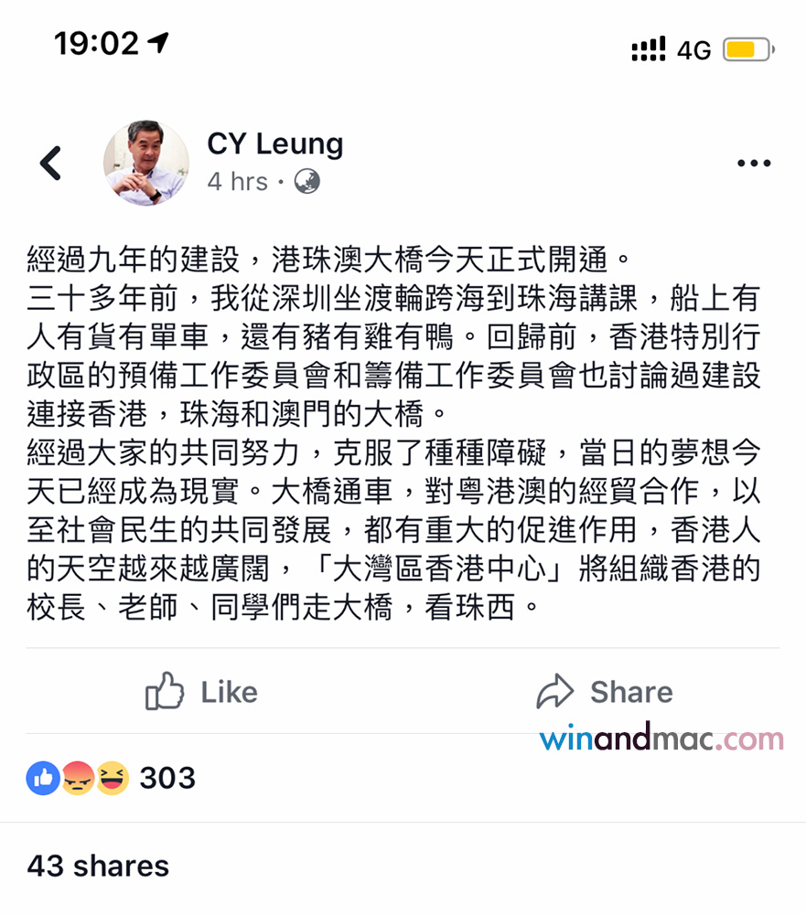 港珠澳大橋通車儀式今日舉行,前特首梁振英都有出席儀式。大橋通車前序,有人認為有點過急,當然亦有人覺得很感動。梁振英當然是後者,認為促進合作,讓香港人的天空越來越廣闊。