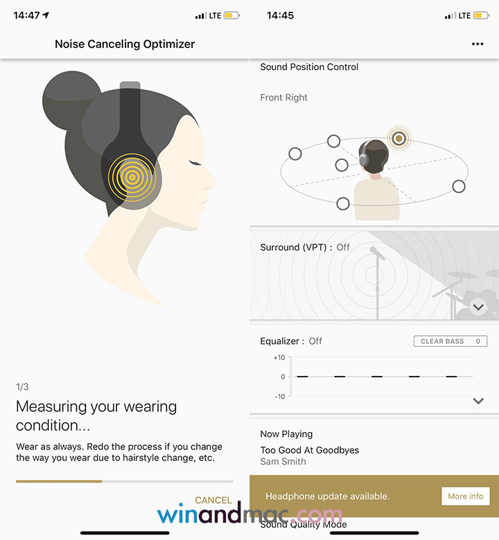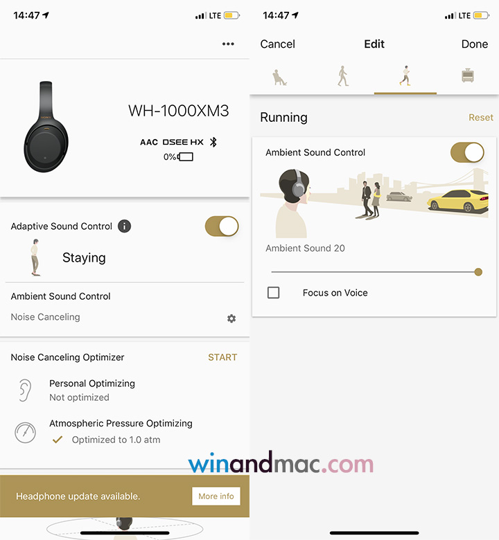 它具備感應環境音效控制Adaptive Sound Control,主要是透過其app控制,無論是否使用Sony手機的也可用到。它可以自動偵測用家目前狀態,然後調整相關的降噪情況。例如行走時可邊聽音樂,邊收聽四周環境聲音,又或在等待火車或交通工具時,亦可同時聽到廣播及音樂。又或乘坐交通工具時,降噪功能便可完全啟動,不受環境聲音影響。