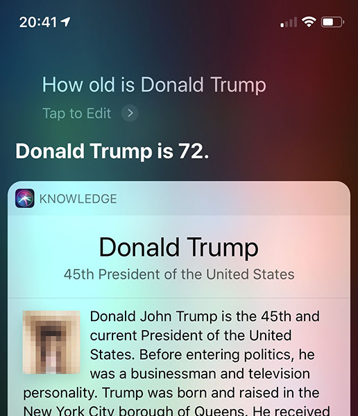 據稱Siri今次出事的原因,又是因為維基百科的資料有問題。有編輯偷偷地更改Donald Trump的樣子的縮圖為男性性器官,Siri沒有過濾直出就發生此情況。事件曝光後,蘋果立即更改結果為簡單網頁搜尋結果便算,至於維基百科則稱已把有關人等封鎖,不准再更改網站內容。