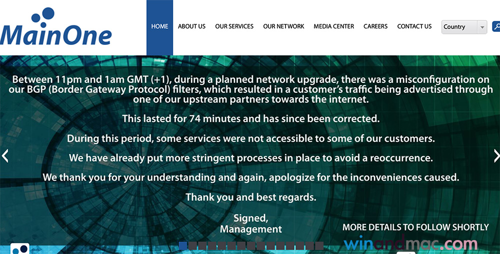 據稱當時有用家發覺瀏覽Google.com時不正常,甚至乎無法打開網頁,Google官方也有提到相關問題,但後來證實不是他們本身問題,現在大家都知道是Main One所引致。Main One稱於當地時間星期一的時候,因升級時設定錯誤,把部份用家的互聯網流量轉到大陸合作伙伴中國電信,引致他們無法正常瀏覽Google。