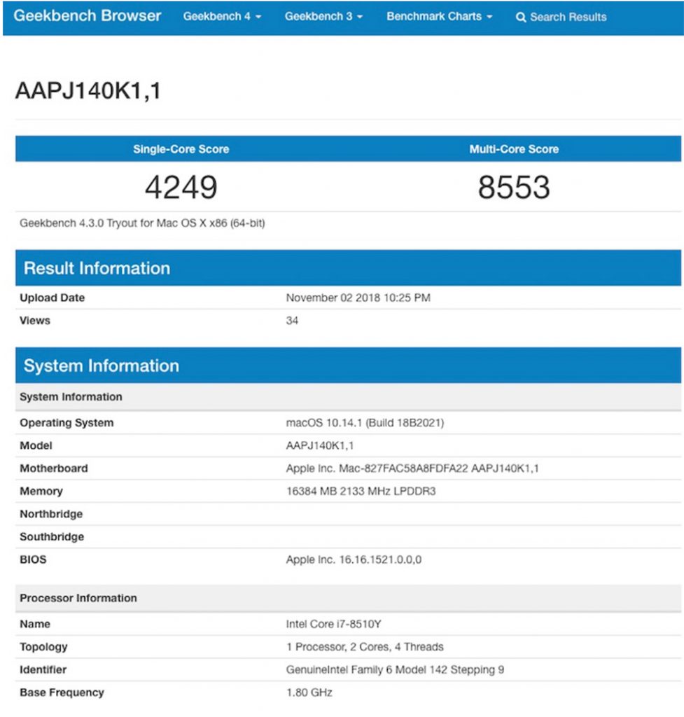 因為有人發現網上流出Geekbench測試數據,當中揭示新MacBook Air或許會有Core i7選擇,比起目前最快都只能選Core i5處理器更佳。有關測試數據中,其Logic Board的號碼與新的MacBook Air一樣,造假的可能性不太高。數據中可看到分數為8,553,比起目前Core i5選擇快8%左右。