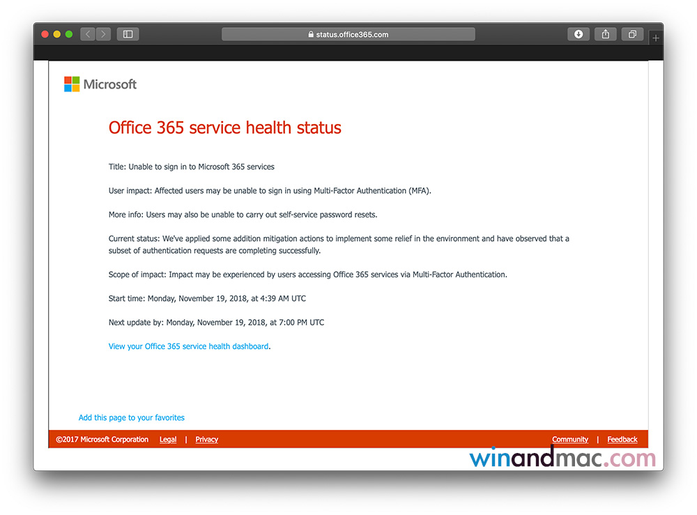 在本文章發表的時候,微軟官方的Office 365一頁仍然顯示著上述訊息,Azure也同樣有問題,微軟稱會推出緊急修復檔,但會密切留意最新情況。由於沒有設置雙重認證的用家反而無事,微軟沒有好好確保雙重認證功能可以100%運作,或許有機會變相令用家日後不敢使用雙重認證,造成安全問題。
