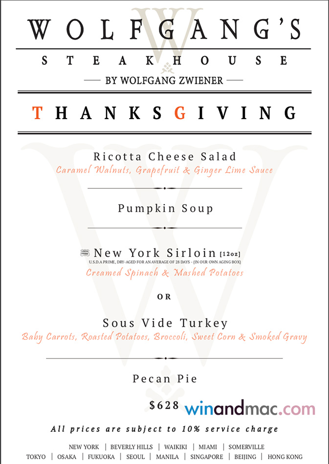 其完整菜單可參考以下圖片,最終售價由官方公佈為準。當中可看到是以瑞可達芝士沙津的和南瓜湯作為前菜,可以開胃兼刺激食慾。每位可選擇一個主菜,包括Wolfgang的招牌12oz紐約西冷牛扒,又或真空低溫烹調火雞。最後的甜品則是胡桃批,建議有興趣的快點預訂,由11月22至24日連續三個晚上都可以享用得到。
