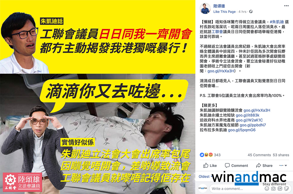 陸頌雄似乎都好嬲嬲豬,話「呢兩日周圍拉人落佢淌臭水。最近就話工聯會議員日日同佢開會都唔舉報佢港獨,該當何罪喎。」。陸話佢地工聯會5位議員立法會大會出席率均為100%,反而朱凱廸大會出席率在全體議員中排尾四,仲未計佢因為多次開會玩嘢而被主席趕離會議廳。