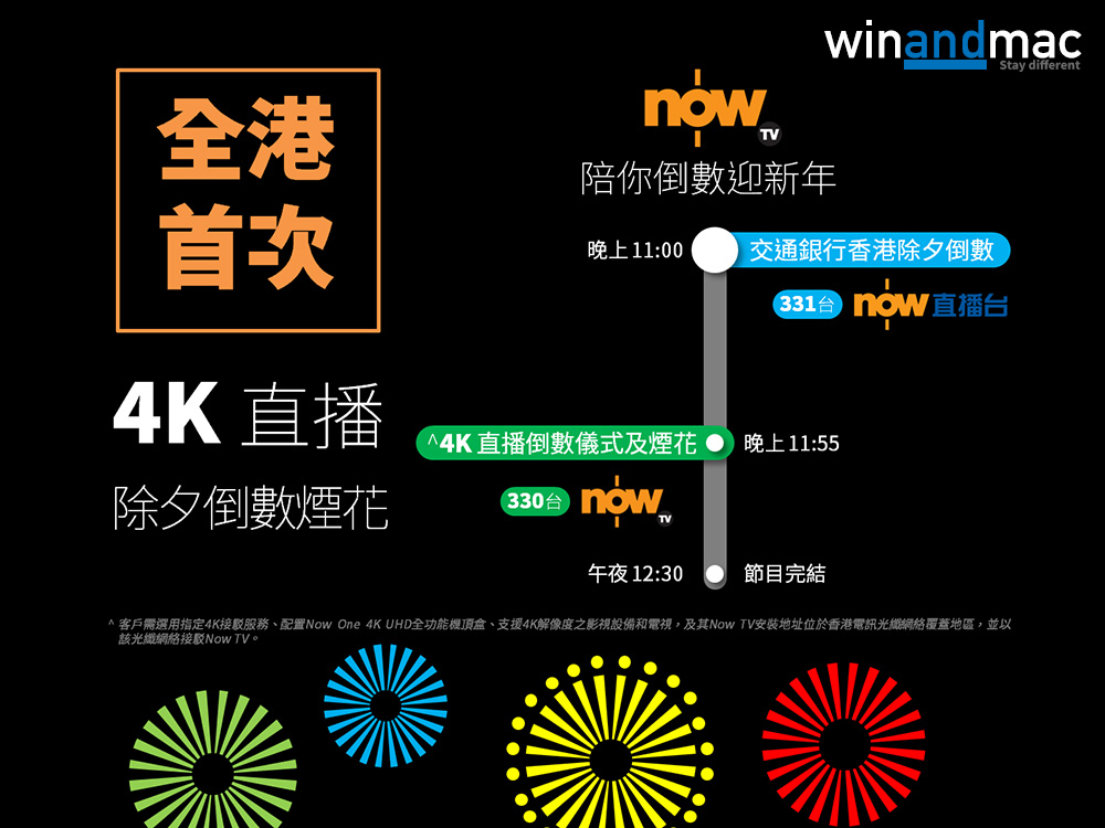 當然,用戶也要選用指定4K接駁服務,支援4K解像度之影視設備和電視,及其Now TV安裝地址位於香港電訊光纖網絡覆蓋地區,並以該光纖網絡接駁Now TV。當晚Now 330台會於11:55pm開始播放4K直播倒數儀式及煙花,用更清晰方式去睇煙花,而331直播台就會在11:00pm開始播放交通銀行香港除夕倒數。