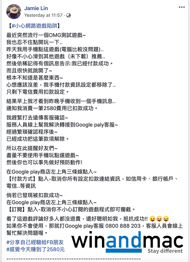 用家Jamie Lin在網上發表文章,稱他在手機上玩OMG時,好像有按到推薦的其他遊戲,但他肯定沒有下載。可是,下一步最嚇人的,是他看到訂閱並付款成功。原本以為沒有什麼問題,因為他的Google Play沒有連結至信用卡或其他付費資訊。可惜的是,過幾天則收到遠傳訊息,稱一筆2580費用已扣款成功,因為他的Google Play雖然沒有付費資訊,但就有連結至電訊商付費設定,故此仍然能成功扣除費用。