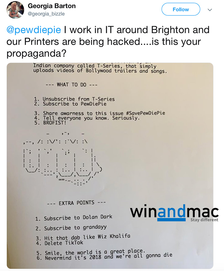 據稱全球有不少的打印機突然自動打印,印出上述的內容,當中寫明要求大家去訂閱PewDiePie YouTube頻道,以及不要訂閱T-Series等。有不少人都有在Twitter上發表有關相片,雖然大家沒有太多投訴,但有不少人都想問究竟發生什麼事情。