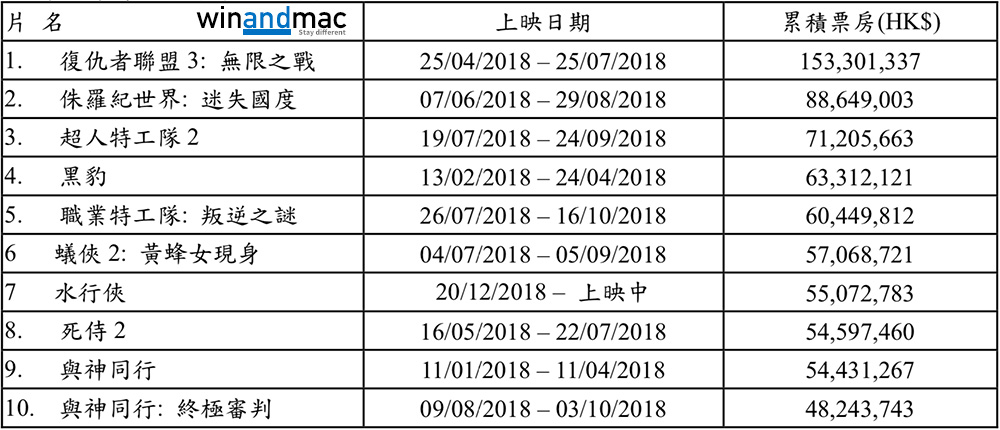 至於非香港電影的頭十位則很容易估到,第一位是復仇者聯盟3:無限之戰,接著是侏羅紀世界:迷失國度,第三位則是動畫超人特工隊2。而上映中的水行俠,也極速擠身在排行榜的第七位,其實都幾強勁。