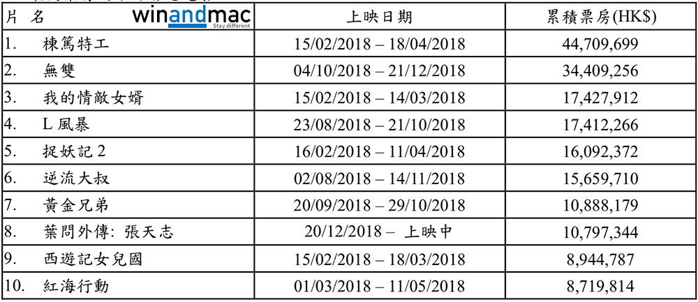 註:上述資料由香港票房有限公司(香港影業協會及香港戲院商會屬下機構)提供給winandmac Media,版權所有,嚴禁一切非授權轉載或再引述報道,如有違者定必以法律追究。