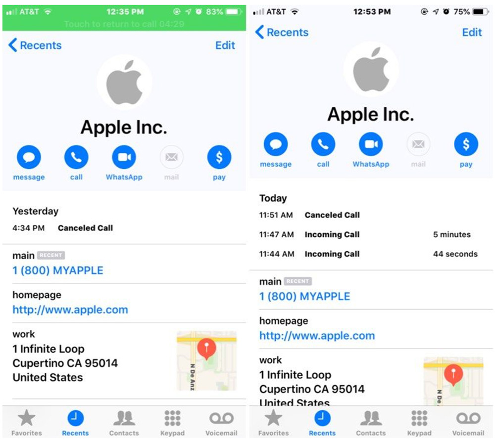 蘋果預設會把其官方電話,1(800)MYAPPLE放在用家的聯絡人中。據稱其中一個個案,就是收到蘋果支援訊息,要求用戶撥打1-866電話。她覺得有可疑,但發覺與有關假電話通話後,通話記錄竟然在真的1(800)MYAPPLE電話中,亦即是説騙徒扮到蘋果真的支援電話。