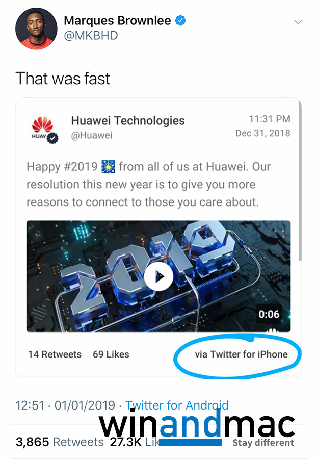 事緣在2019年快來到的一刻,華為外國官方帳戶Huawei Technologies發了一篇祝賀文章迎2019,可是被眼利的著名YouTuber Marques Brownlee睇到,有關文章右下方竟然寫著「via Twitter for iPhone」。雖然華為後來都極速發現錯誤,並把文章刪除,但有關錯誤已被Marques截圖,並已四圍瘋傳。