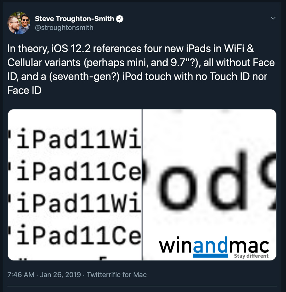 從有關的相片可以看到,當中會有四部新iPad,估計是兩款,因為當中分別是Wi-Fi及具備網絡型號。最令人驚喜的是,當中可以看到有一部新的iPod Touch,目前仍有賣的iPod Touch為iPod 7,1,但在iOS 12.2測試版可看到iPod 9,1。當然,蘋果到最尾是不是真的會推出新產品,暫時仍未清楚。