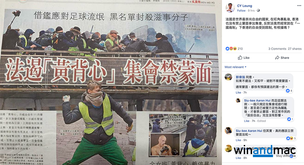 梁振英寫道「法國是世界最崇尚自由的國家,在旺角暴亂後,香港也沒有禁止蒙面參加集會,反對派竟然經常說在「一國兩制」下香港的自由受到限制,有根據嗎?」。工聯會郭偉強居然也趕緊擦鞋,留言寫「如果不違法,又和平,絕對不需要蒙面。通常蒙面,都係有預謀違法的第一步。」。