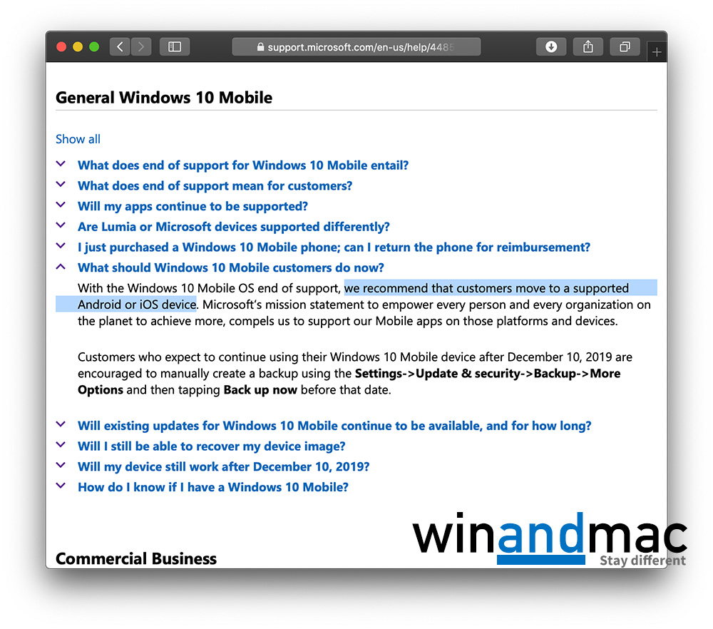 有網站發現,微軟已經更新支援文件,表明在2019年12月10日開始,將會暫停對Windows 10 Mobile的一切支援。官方更表明,用家應該轉用Android或iOS平台的智能手機。