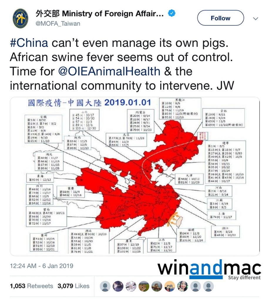 台灣外交部早前也忍不住在Twitter發表文章,顯示中國大陸今年最新的疫情,可謂幾乎全紅,情況十分嚴重。外交部忍不住寫「管自己的豬都管不好」,希望國際相關組織能夠介入,阻步大陸非洲豬瘟傳開去。