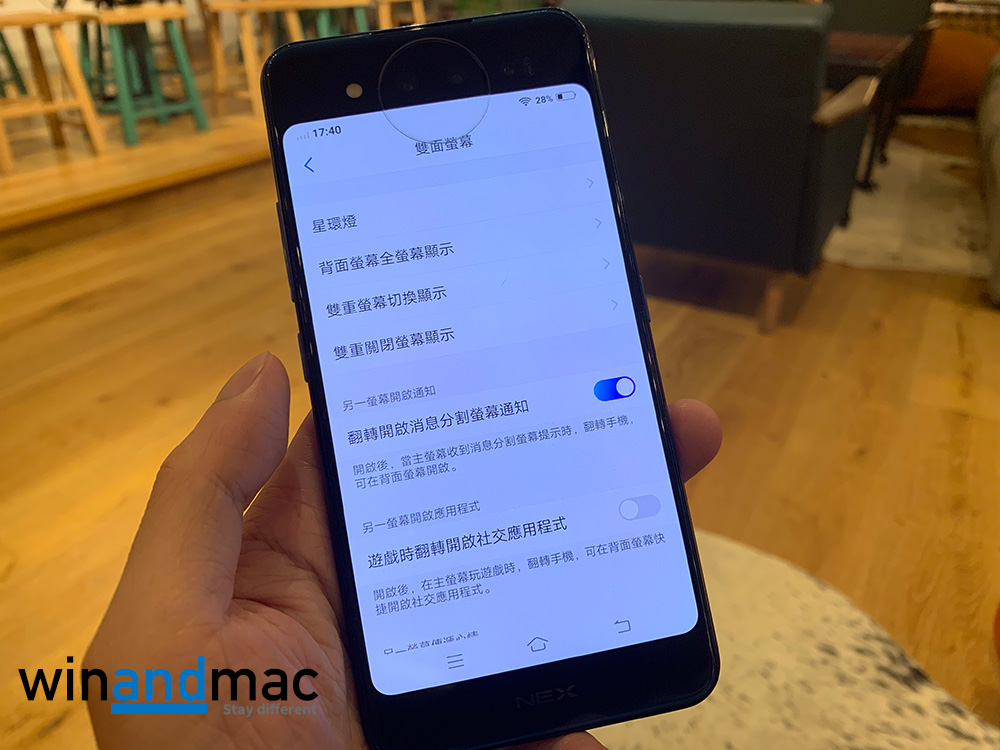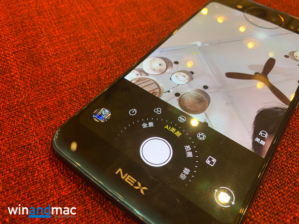 至於後方的螢幕其實也是AMOLED,所以顯示質素其實也不錯,大小為5.49″,解像度都有1080 x 1920。後方螢幕頂部有三個鏡頭之多,當中的雙鏡頭分別是12MP + 2MP,而且亦有補光燈。大家或許都已經估到,其實在使用前面的螢幕時,開啟鏡頭後若選擇自拍,Vivo NEX就會提示大家用另一邊的芒。有趣的是,後方的鏡頭上還有一個圓形,可以發出寫真光效,就像幫你打個燈一樣,手機中極少見,令用家自拍時效果更好。