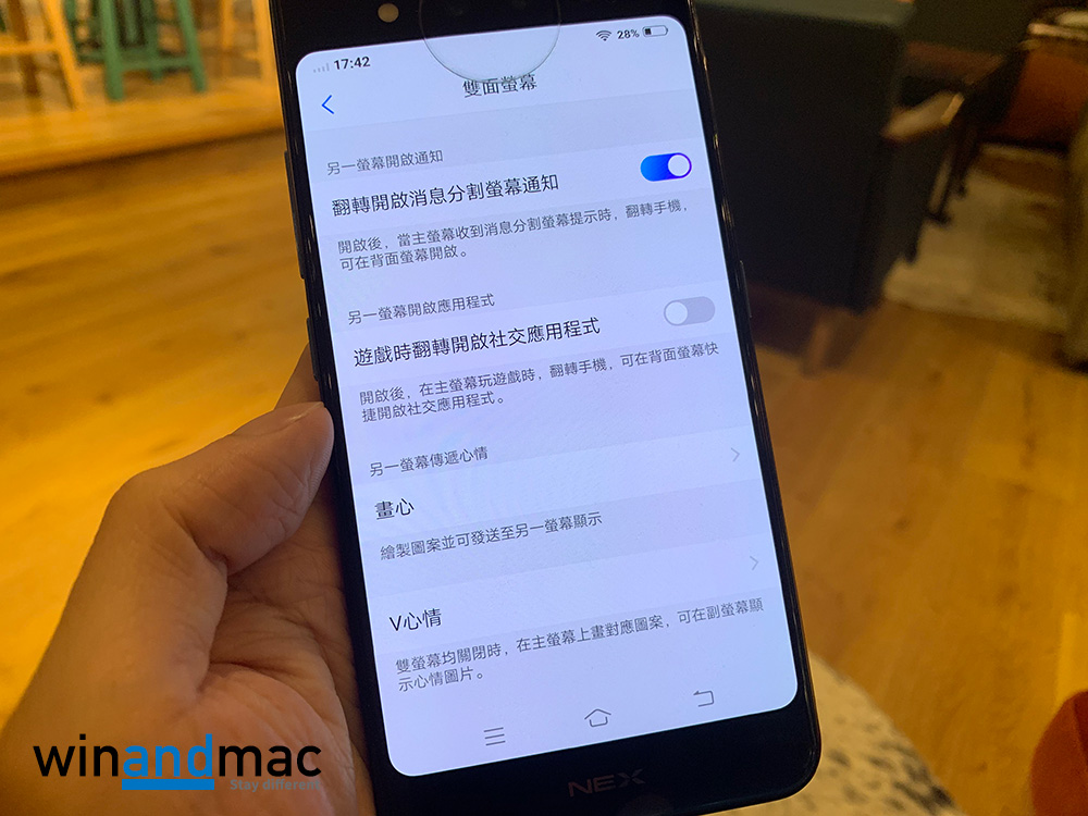 系統設定中,還有一項是專為雙面螢幕而設,大家從中或許可以發掘多一點雙芒的好處。例如當中有一個選項,啟動後用家打機時,如有需要可以一翻轉螢幕,就極速查閱社交網絡。又例如有一個畫心情功能,用家可以在一邊螢幕畫你目前心情,對方看到你機背後面的螢幕時,可以即時看到你所畫的心情。