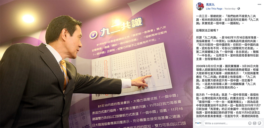 一月三日,蔡總統說,「我們始終不接受九二共識,根本的原因就是,北京當局所定義的『九二共識』其實就是一個中國,一國兩制」。