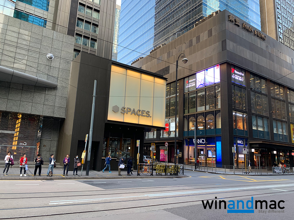 在干諾道中可以看到Spaces大新行的logo,它本身有三個入口,除干諾道中外,還有入口可通往永和街和德輔道中。地面樓層為接待處,可看到本身以落地玻璃設計為主,增加自然光。地面亦設有很大空間,讓用戶的客戶可以舒適地等候,而有關空間有時也可以變身為活動場地。