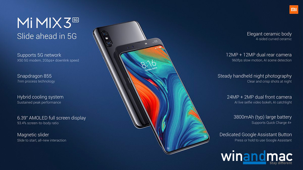 不過,今次使用Qualcomm X50晶片,在5G支援上速度可達2Gbps。處理器為Qualcomm 855,AMOLED螢幕亦因為前置鏡頭要推出來才用到,達6.39″,解像度為1080p,不少人關心的電池都達3800mAh。新的MIX 3將有藍色和黑色選擇,售價為€599。