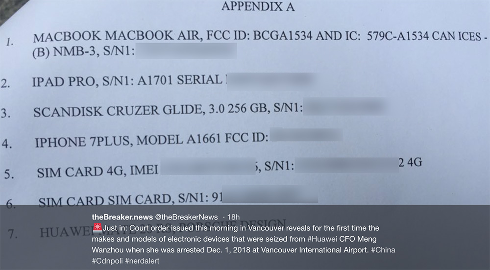 🚨Just in: Court order issued this morning in Vancouver reveals for the first time the makes and models of electronic devices that were seized from #Huawei CFO Meng Wanzhou when she was arrested Dec. 1, 2018 at Vancouver International Airport. #China #Cdnpoli #nerdalert pic.twitter.com/2YFNbXt8Yn