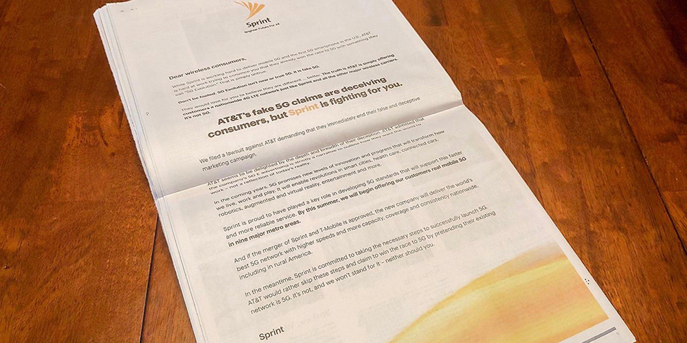 不熟識什麼是5G、6G的人當然佔大多數,所以AT&T早前的假5G扮5G其實是4G LTE Advanced的宣傳,絕對是有影響。T-Mobile很早就串爆,Sprint則更進一步,找法庭控告AT&T誤導。如今,他們更花了不少金錢,為此登報紙頭版廣告。