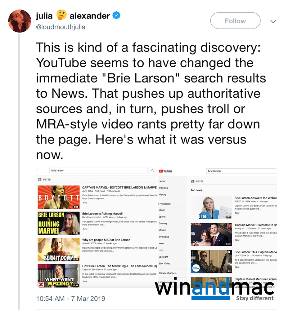 可是,YouTube似乎認為這些影片都是刻意針對,於是便更改搜尋的邏輯,令這些影片不會再這麼容易顯示,更不會排在頭位。據稱,其方法就是令搜尋相關字詞時,先出現新聞或媒體機構的內容,那麼觀眾就會看到從信任的媒體的內容(上圖左與右的比較),而不是那些刻意針對Marvel隊長的影片了。