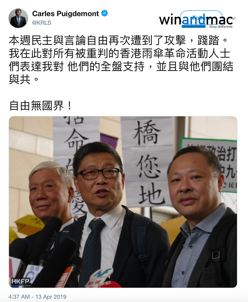 佔中案於上星期裁決,佔中九子未被判刑,但已經被判罪成。曾努力爭取加泰隆尼亞獨立的前主席Carles Puigdemont,在日前(4月13日)特別地用上繁體中文於Twitter發文,稱自由無國界。