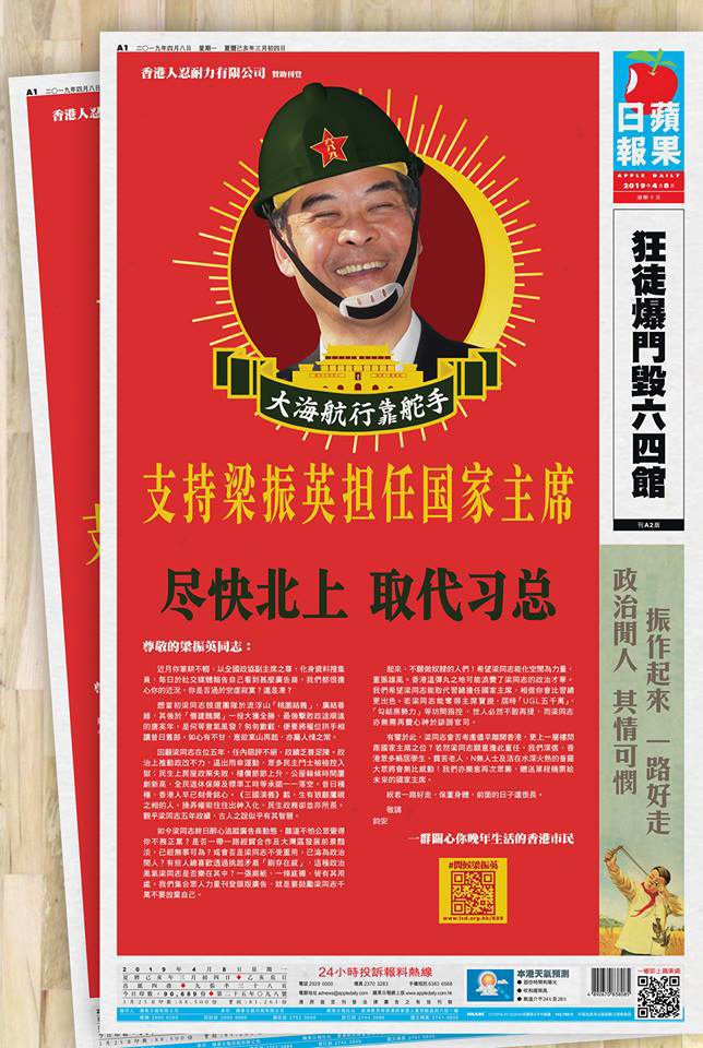 再看多一次廣告的設計,以及蘋果日報處理的手法,更可看到整件事只是「攞個彩」,這麼大的傳媒機構為了「笑」一個人,竟然做了這件柒事。唯一正面的,就是錢是去了蘋果日報,幫了蘋果日報營運,可以再捱長多一點時間。