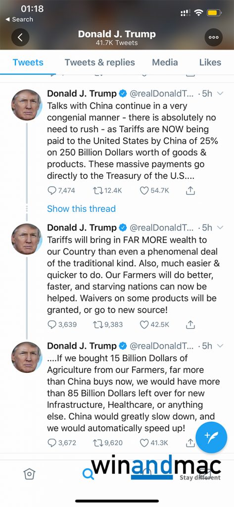 相關Tweets數量眾多,而且部份是不夠一小時便發一篇。例如特朗普在當中提到,與中國談判不用急,因為中國現在就要付25%關稅,直入美國國庫。特朗普又認為,關稅為美國所帶來的財富比任何傳統的方式更強勁。他亦狂罵中國加入世貿組織後,一直不守規則,美國受中國的不對等對待。