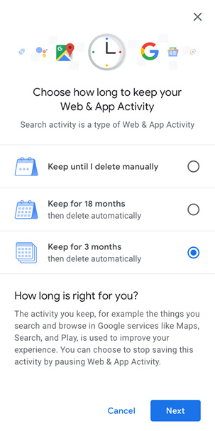 用家很快就可以在Google設定中,像上圖設定要讓Google儲存多久瀏覽記錄,當中可選擇自行刪除、保留18個月又或保留3個月。若選擇保留3個月或18個月,當時間一過Google就會自動把用家的搜尋記錄、位置記錄和應用程式記錄。
