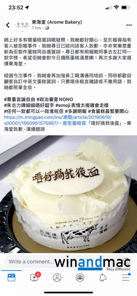 事件曝光後,東海堂向傳媒回覆並致歉。他們也在官方放上「唔好搞我後面」的蛋糕相,強調「只要唔係粗言穢語或不雅用語,我哋都照單全收。」,日後會加強對員工的培訓和溝通。當中更加入政治審查NONO、尊重言論自由、食蛋糕最緊要開心等hash tag,網民面對這樣強勁公關,都似乎原諒了東海堂。