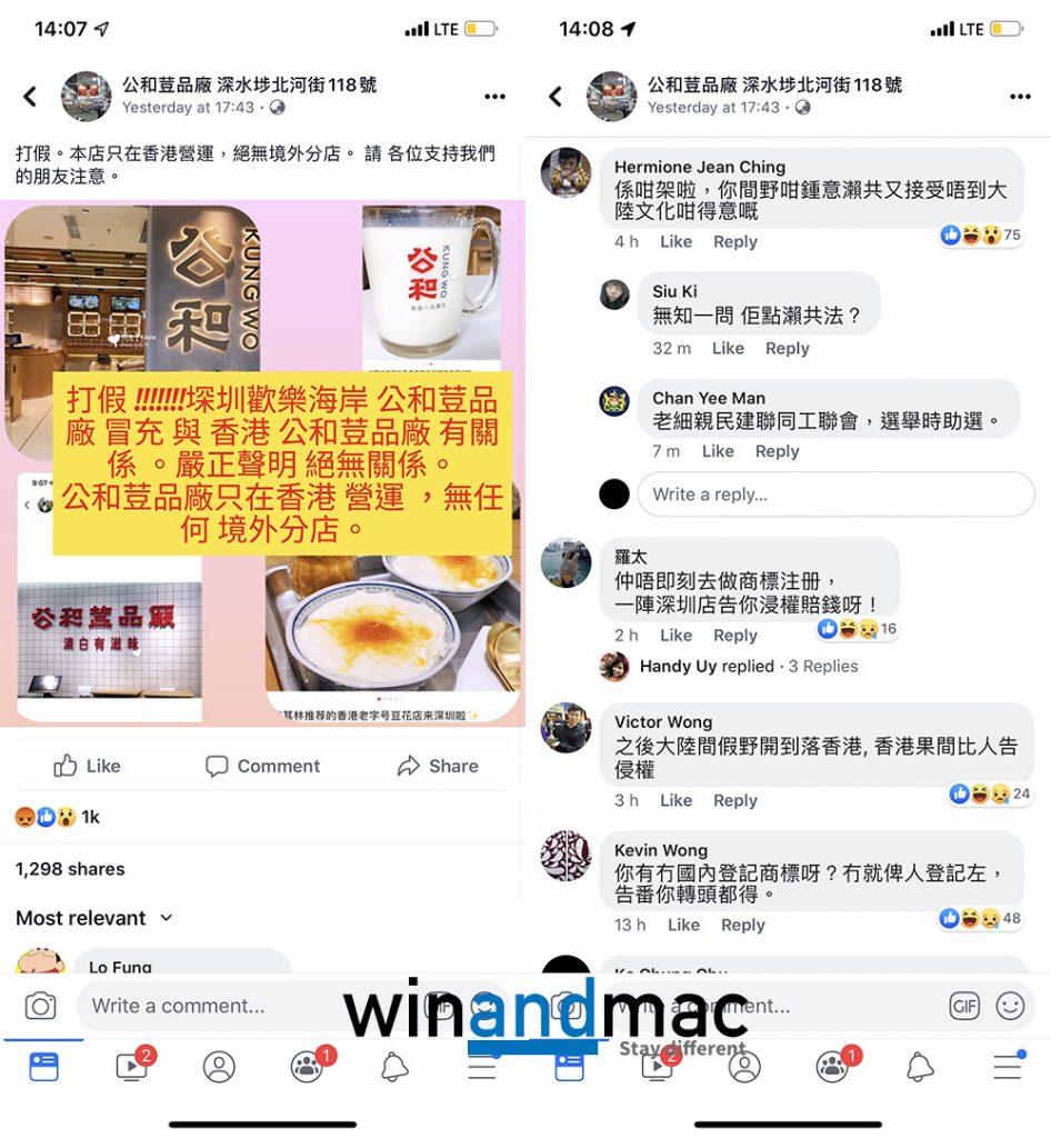 位於深水埗的公和荳品廠已有多年歷史,過往曾經歷不少起跌,後來獲建制派和建制媒體力撐,大受不少自由行大陸旅客歡迎。公和荳品廠今天於Facebook專頁發出通知,稱他們發現大陸堔(深)圳有人冒充其品牌。
