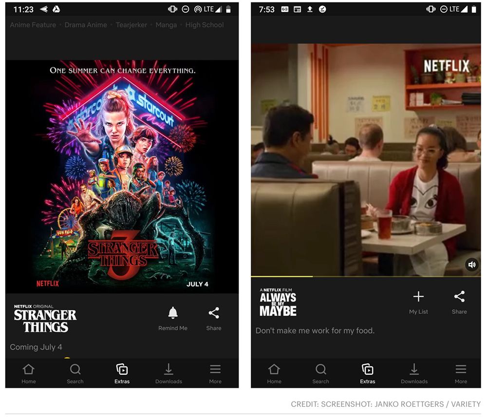Netflix早前在app中加入與Snapchat或Instagram Stories類似的功能,讓大家一按以直立方式預覽一些節目,啱睇的才按下播放去看。Netflix如今再嘗試加入像Instagram的News Feed,名為Extra,讓大家發掘更多不同的內容。