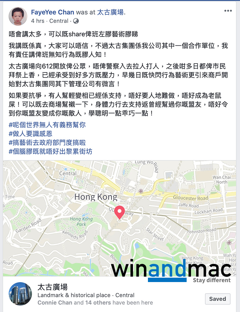 有關行動被不少示威者責備,因為被不少網民認為意義不大,以及進一步影響商戶。有人在數小時前於Facebook發表文章(上圖),稱「太古集團係我公司其中一個合作單位,我有責任講俾班無知行為既膠人知」。當中提到,自反送中示威發生,有關方面已承受不少壓力。今次突然兼無意義的快閃行動,引來商戶開始對太古集團同其下管理公司有微言。
