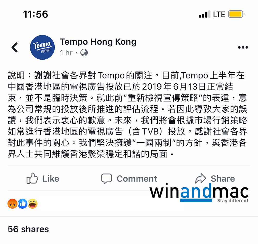 日前有多間公司,稱會審視在TVB投廣告與否。當時不少網民和傳媒都高興地,以為真的會撤回投放廣告。可惜的是,再有多一間公司似乎仍然會支持TVB。Tempo Hong Kong數小時前發表更新,當中「香港」一字更專登寫成中國香港,還相當政治化地提到堅決維護一國兩制,強調和諧重要。