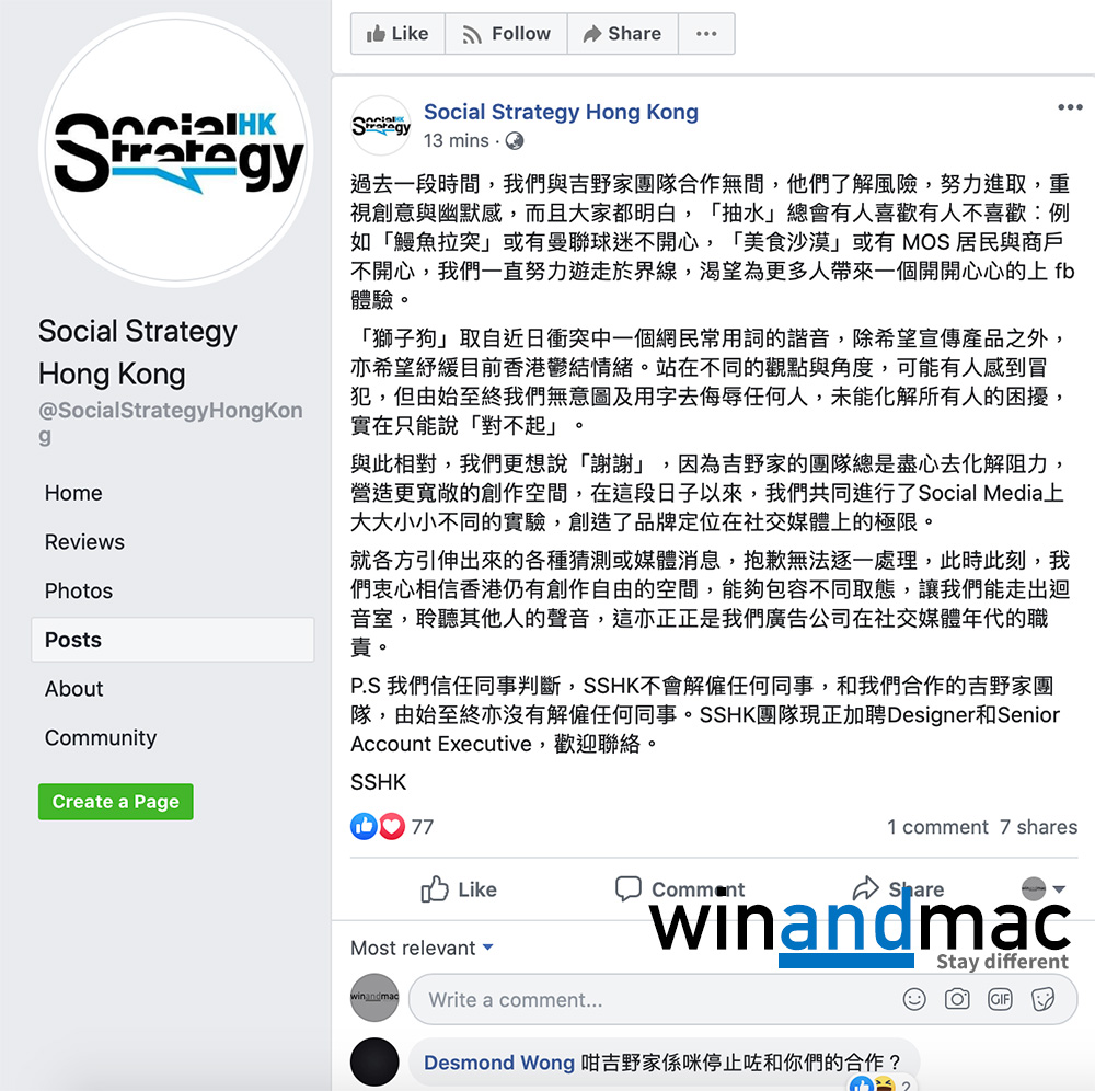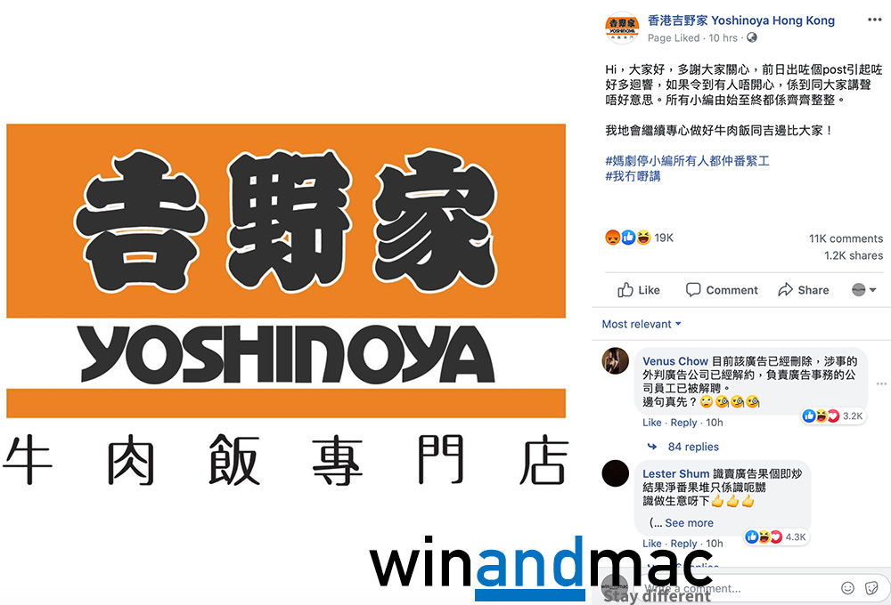 有趣的是,吉野家其後發出聲明,稱所有人都齊齊整整。而承接吉野家Facebook的外判廣告公司Social Strategy Hong Kong,也在其專頁發表文章,稱吉野家一直給予很大創作空間,並指沒有解僱公司任何員工。但對於有人問到,吉野家香港會否再找他們合作的時候,則沒有回應。