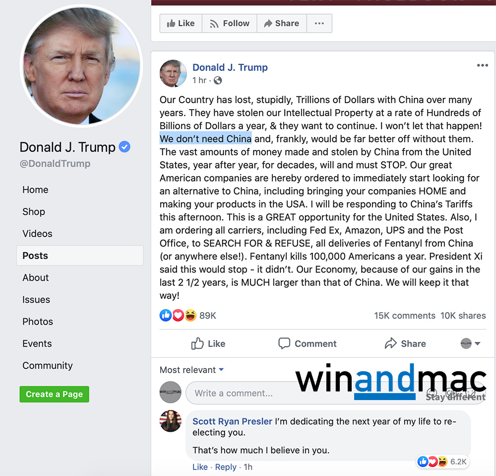 特朗普稱,已經相當富有的中國仍然沒有停止偷取美國的智識產權,他必定會出手停止。然後,他稱美國不需要中國,並指沒有中國後他們會更好。特朗普命令美國公司立即尋找中國的代替方案,包括把公司搬回美國,由美國本土生產。