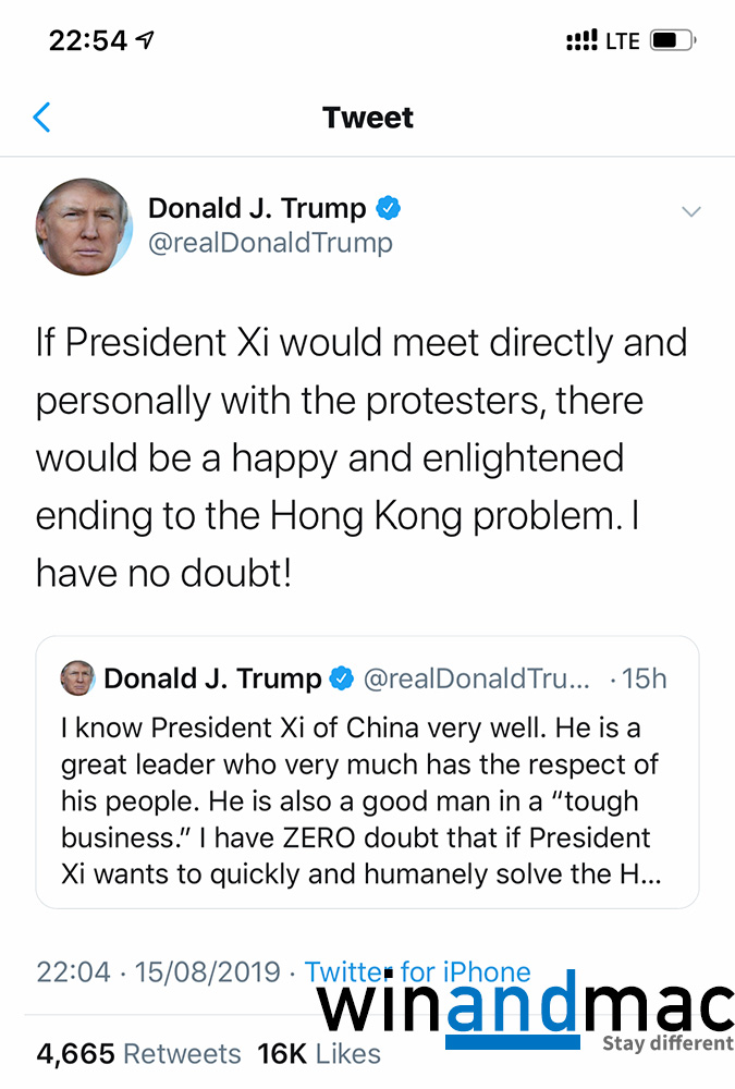 美國總統特朗普Donald Trump於數小時前才提到香港,沒想到不足24小時後繼續關心大家。他直接向中國國家主席習近平提出建議,讓他可以快速又開心地解決香港的問題。