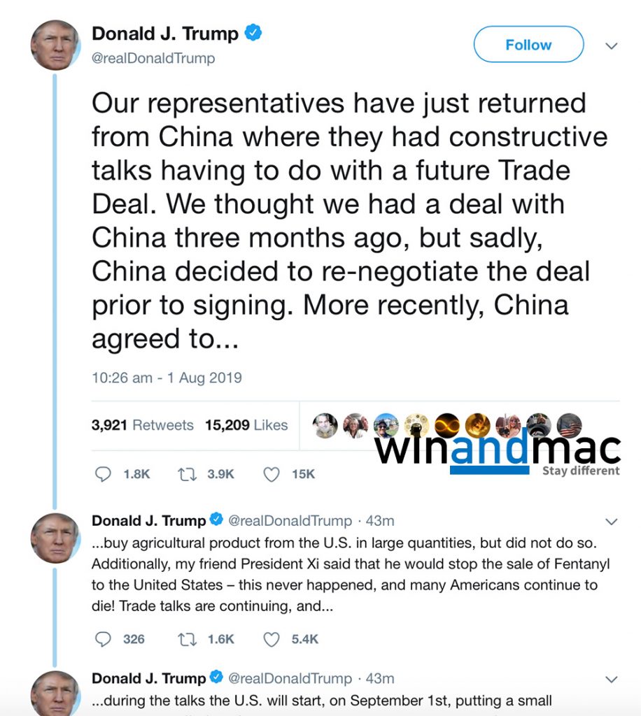 有關措施將於9月1日生效。特朗普雖然在Twitter中稱習近平為朋友,但亦有再重提中國沒有對現承諾,購買美國的農產品。