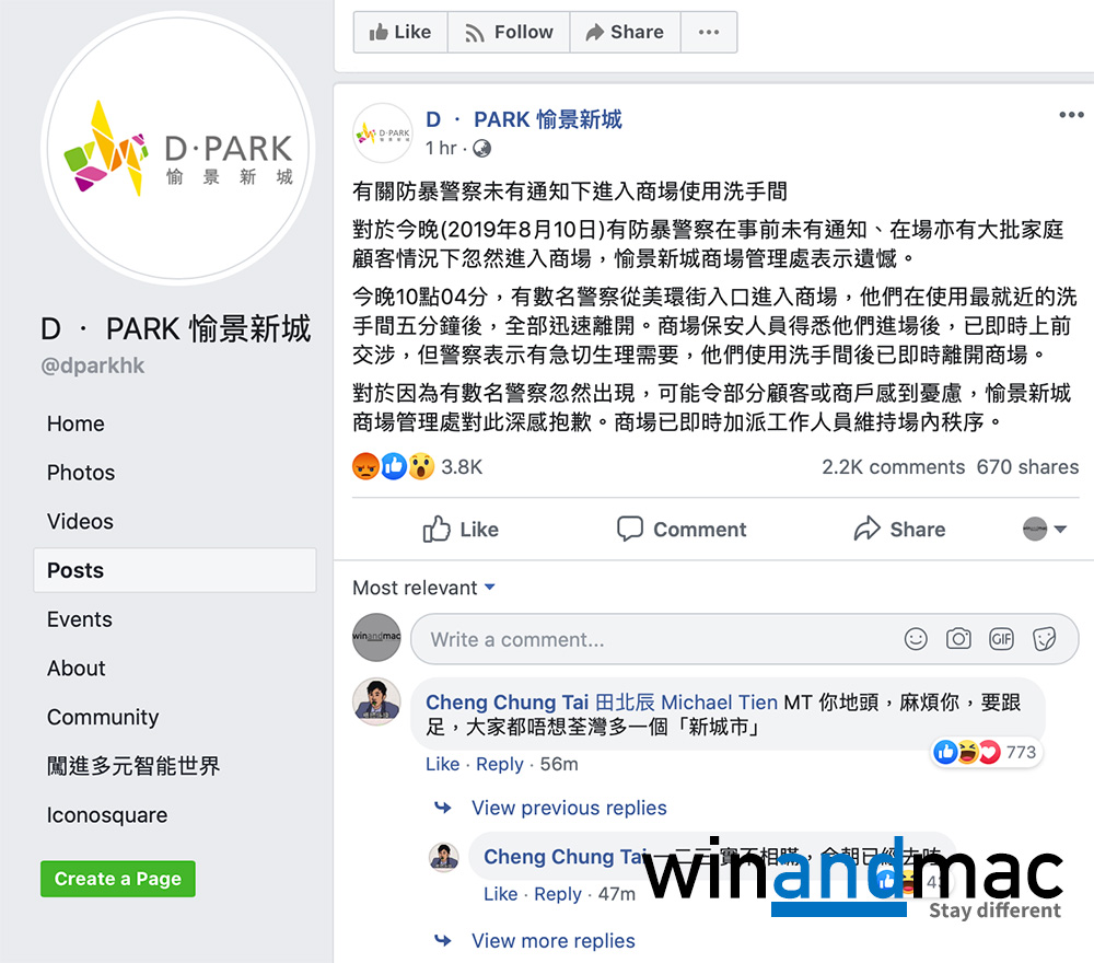 D.PARK愉景新城針對此情況作出回應,稱警察真的在沒有通知下衝入商場,亦對受影響人士作出抱歉。D.PARK愉景新城稱是因為警察有生理需要,才進入D.PARK愉景新城借廁所。可是,有不少心水清的網民知道警署就在旁邊,根本沒有此必要向商場借廁所。
