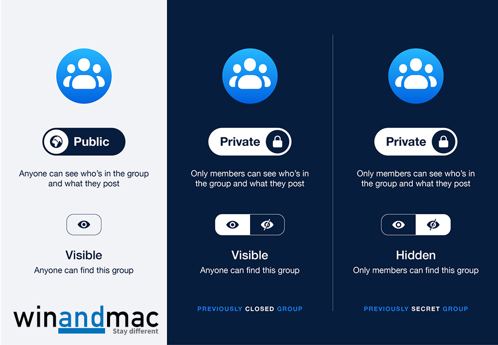 故此,他們更新相關私隱設定,只有兩大分類:Public公開和Private私人。而Private私人下,則分是否Visible顯示或Hidden隱藏,全面取代Closed和Secret。前者可以讓大家找到相關群組,但看不到當中內容,後者僅讓會員可以到相關群組。