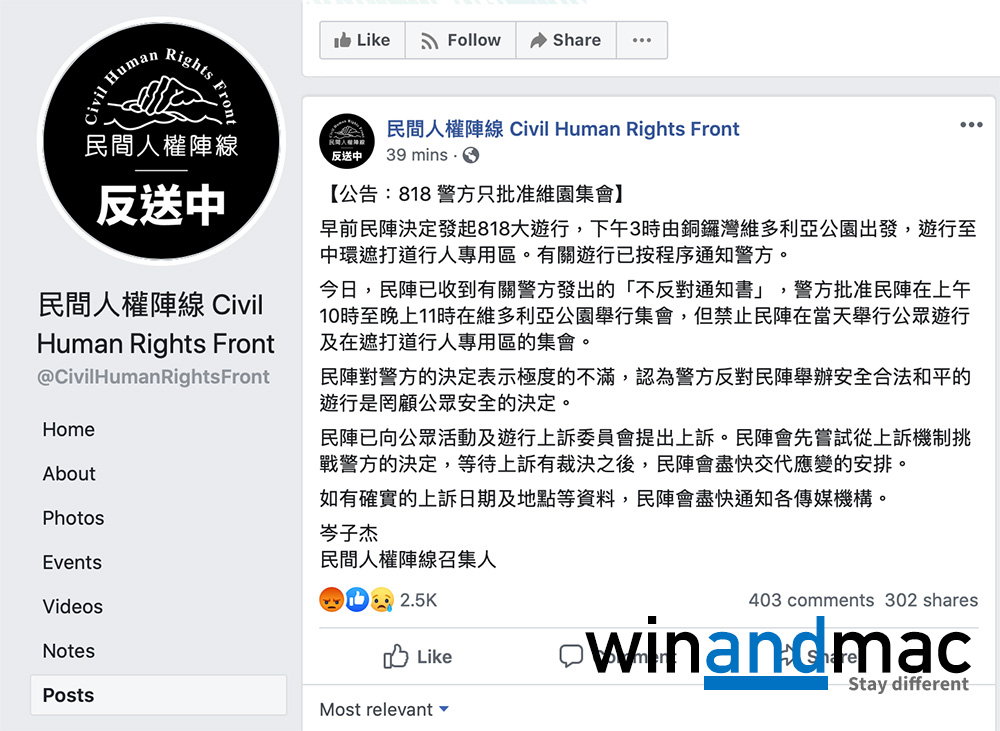 或許大家都估到,由民間人權陣線發起的818和理非遊行,在申請不反對通知書時,遭到警方反對。警方只批准民陣在10:00am – 11:00pm在維多利亞公園舉行集會,全面禁止在當天舉行公眾遊行及在遮打道行人專用區的集會。